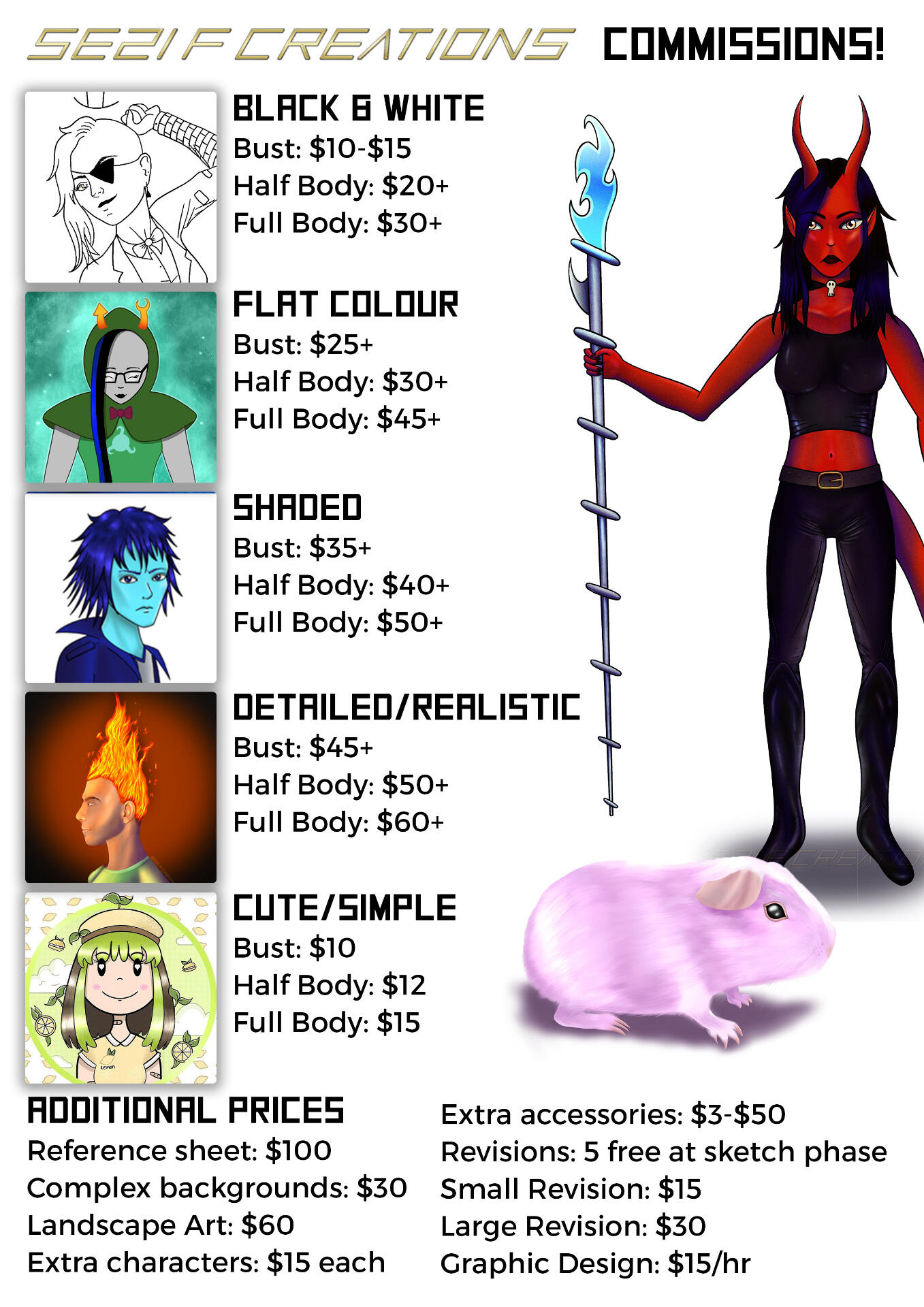 Hi, my name is Sezi! I'm a freelance graphic designer and artist who loves sharing my creations! I enjoy making art in my spare time including character drawings, landscapes, geeky stuff, and animals using a variety of mediums. I also create custom badges and patches.